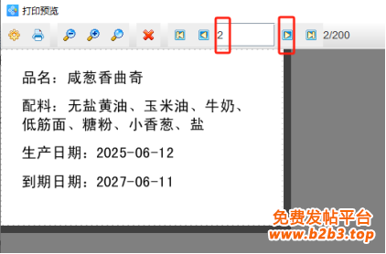 5. 制作完成之后,点击软件顶部的“打印”按钮,在打开的窗口中设置数据量(标签的总个数)为200、开始页码(从那一页开始打印)为1,点击结束页码(到那一页结束打印)后面的“尾页”,然后点击下面的“预览”按钮,翻页查看批量生成的生产日期和到期日期,预览无误就可以直接连接打印机打印出来了。